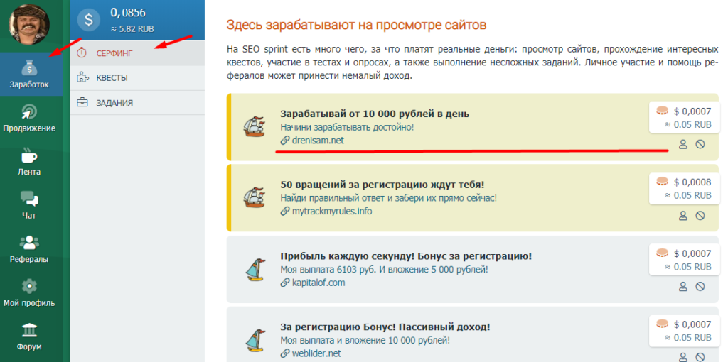 Заработком это назвать сложно, может быть подработка. Серфинг это самый элементарный способ получения денег. Открываете раздел «Заработок», далее выбираете «Серфинг». Там вы увидите список сайтов, которые нужно посетить.