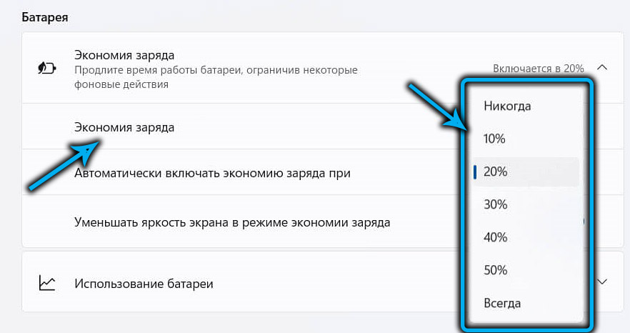 Отметим, что, когда ноутбук работает от сети, функция экономии заряда становится недоступной.