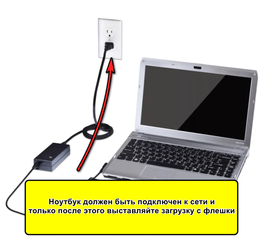 И перед тем, как загрузиться с флешки на ноутбуке, убедитесь, что он подключён к электросети. У некоторых производителей стоит защита, которая блокирует загрузку с внешних накопителей, если девайс работает от батареи (например, в некоторых моделях HP и DELL есть подобное ограничение).