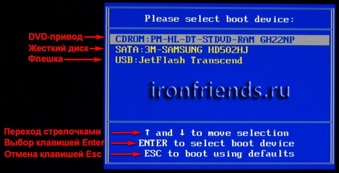 Плюсы такого способа очевидны – не нужно копаться в BIOS, не нужно потом возвращать настройки BIOS обратно (хотя это не всегда обязательно) и достаточно вызвать это меню всего один раз, так как после начала установки Windows это уже не потребуется. Кроме того, использование «Boot Menu» не изменяет настройки BIOS или UEFI.