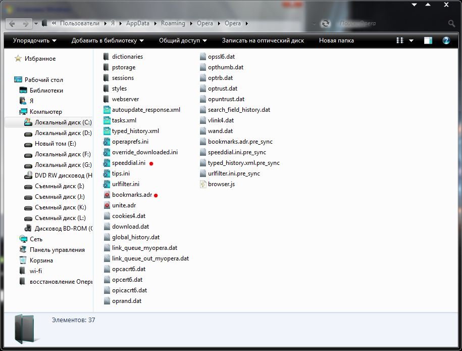 1. Находим файлы закладок и Экспресс-панели Оперы — bookmarks.adr и speeddial.ini