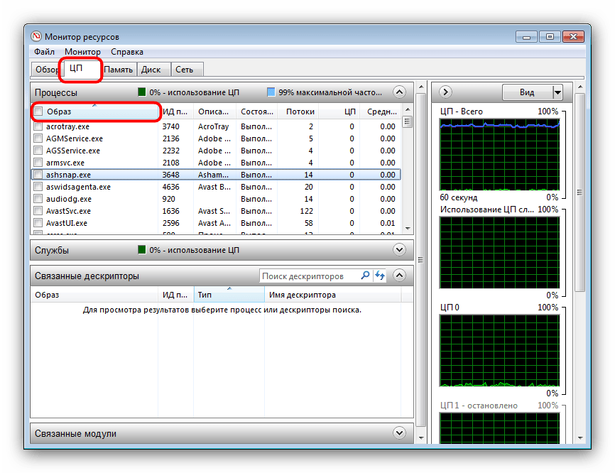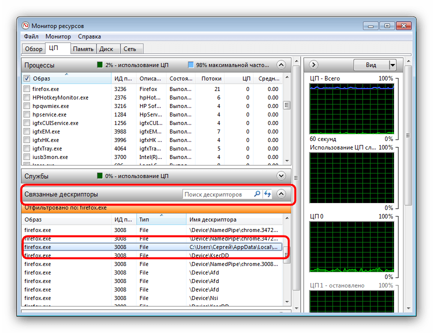 Обнаружив нужный процесс, поставьте галочку в чекбоксе напротив него, а затем щёлкните по вкладке «Связанные дескрипторы». Откроется список дескрипторов, к которым обращается процесс. Поищите среди них видео и/или изображения – как правило, они обозначены типом «File». В столбце «Имя дескриптора» находится точный адрес и имя проблемного файла.