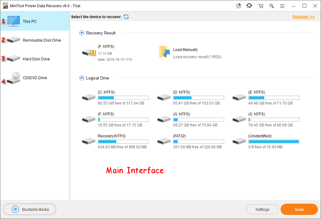 В главном интерфейсе программы вы увидите четыре опции на левой панели: Этот ПК , Съемный диск , Накопитель на жестком диске , и CD / DVD привод . Вы должны выбрать тот, который больше всего удовлетворяет ваши потребности в процессе восстановления данных.