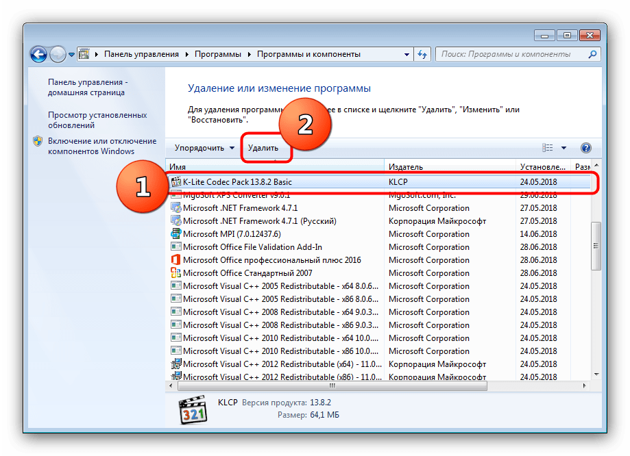 В списке установленных приложений найдите компоненты, в названии которых присутствует слово codec. Как правило, это K-Lite Codec Pack, но возможны и другие варианты. Чтобы удалить кодеки, выделите соответствующую позицию и нажмите кнопку «Удалить» или «Удалить/Изменить» вверху списка.
