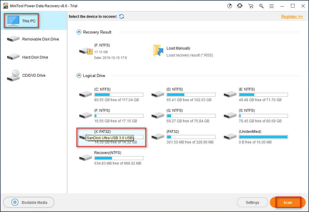 Шаг 2 : выберите подходящий вариант на левой панели. Затем выберите целевой раздел / жесткий диск / USB-накопитель / SD-карту / CD / DVD для сканирования, нажав кнопку Сканировать в правом нижнем углу.