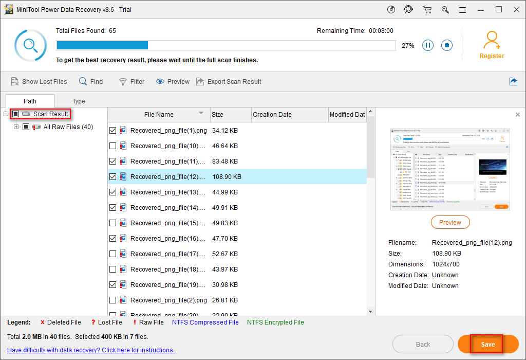 Шаг 3 : внимательно просмотрите результат сканирования, чтобы найти все необходимые данные. Затем проверьте их и нажмите Сохранить кнопку, чтобы поместить их в безопасное место (другой диск с достаточно свободным местом).