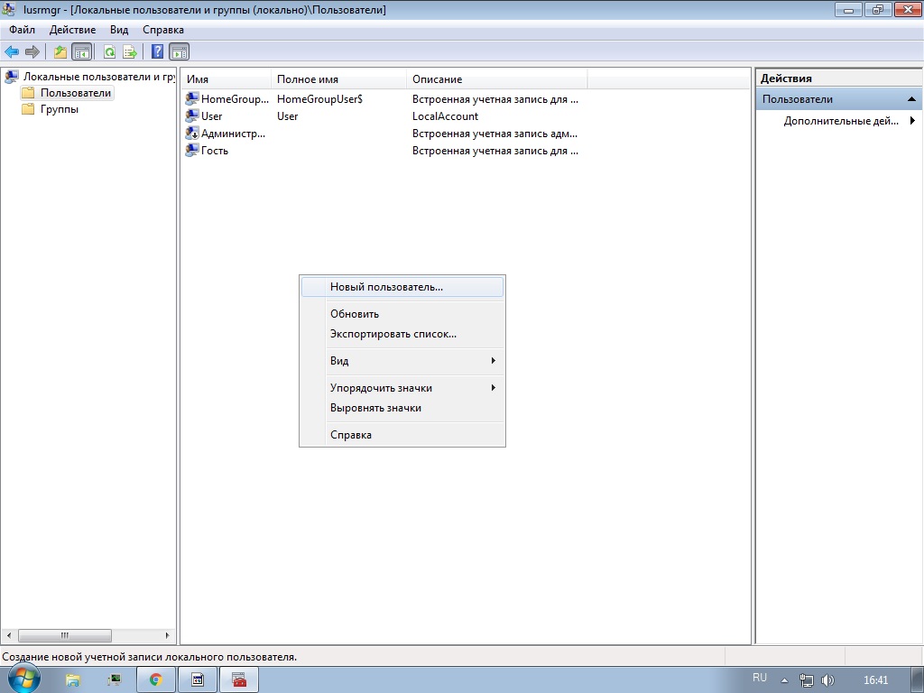 - Нажмите на папку «Пользователи» и в окне списка вызовите контекстное меню, затем кликните «Новый…».