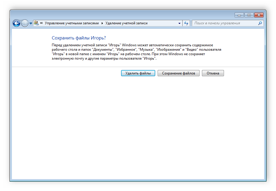 Выбираете пункт «Удалить файлы», нажимаете кнопку «Удаление учетной записи».