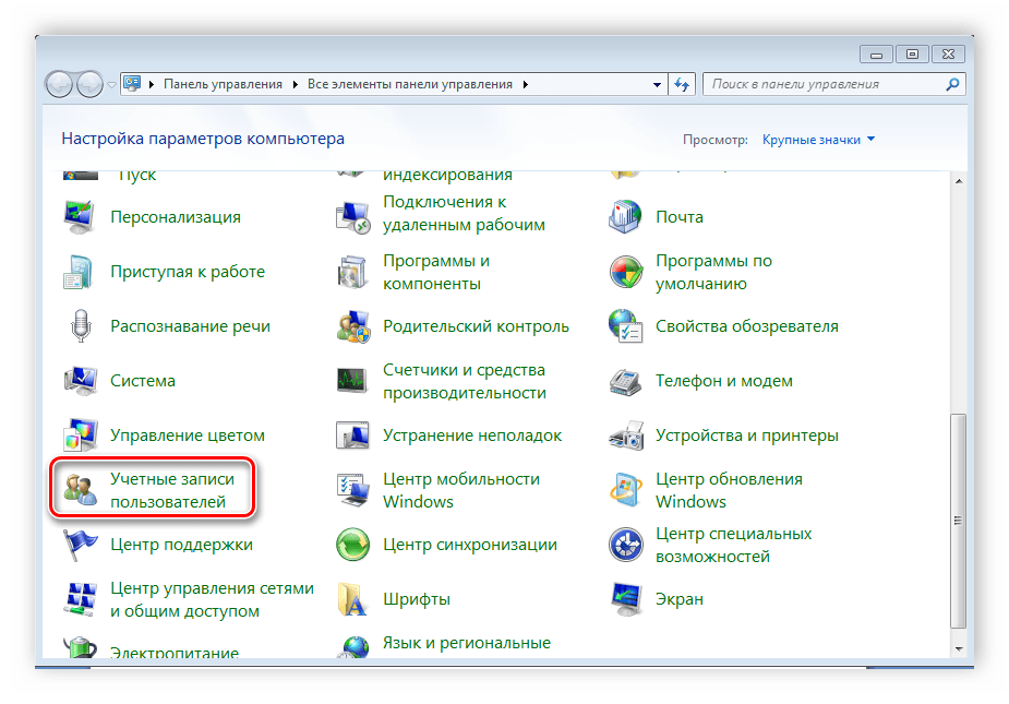 Если вдруг вид значков у вас не как на моем примере ниже, то просто введите в поисковую строку вверху «учетные записи» и откройте найденную категорию.