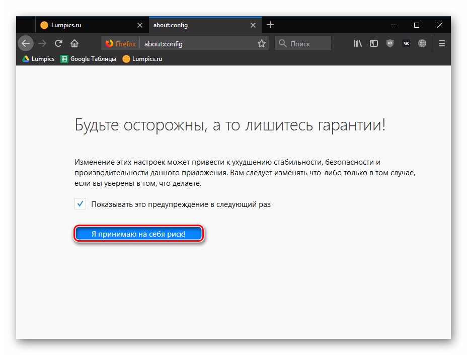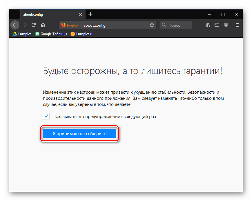 На странице с предупреждением кликните по кнопке «Я принимаю на себя риск!». Процедура смены языка не навредит браузеру, однако здесь есть другие важные настройки, необдуманное редактирование которых может привести к неработоспособности браузера.