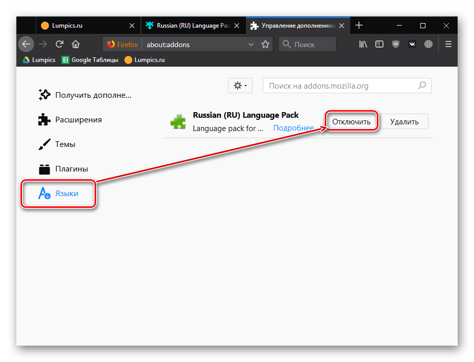 Переключитесь на раздел «Языки» («Languages») и удостоверьтесь, что рядом с Russian Language Pack кнопка, предлагающая его «Отключить» («Disable»). В этом случае просто закройте вкладку и переходите к следующему шагу. Если название кнопки будет «Включить» («Enable»), нажмите на нее.