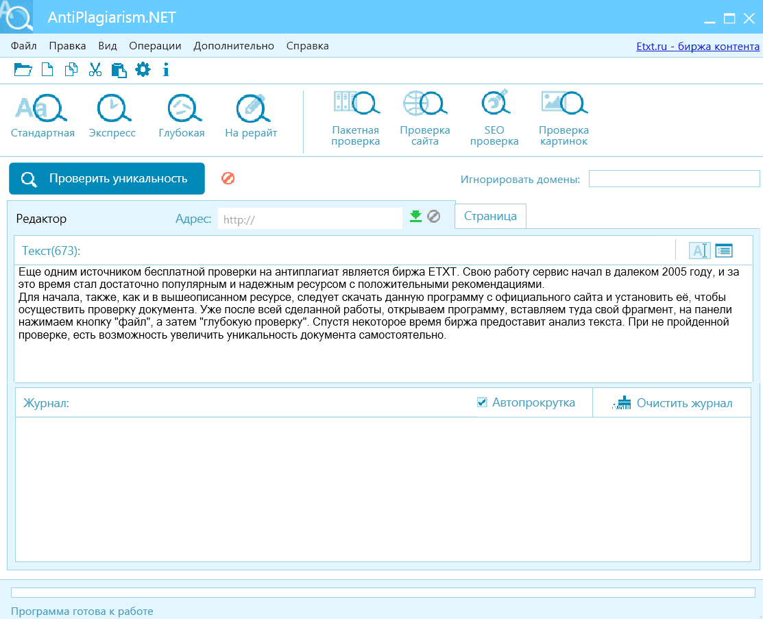 - Etxt.ru/antiplagiat — аналогичная программа, позволяющая делать быструю и глубокую проверку уникальности текста, в программе также есть сео-инструменты и возможность проверки качества оптимизации.