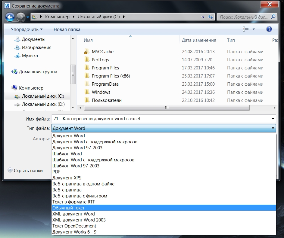 - Появилось диалоговое окно? Найдите внизу строку «Тип файла», нажмите на стрелочку и поищите в предложенном списке «Обычный текст».