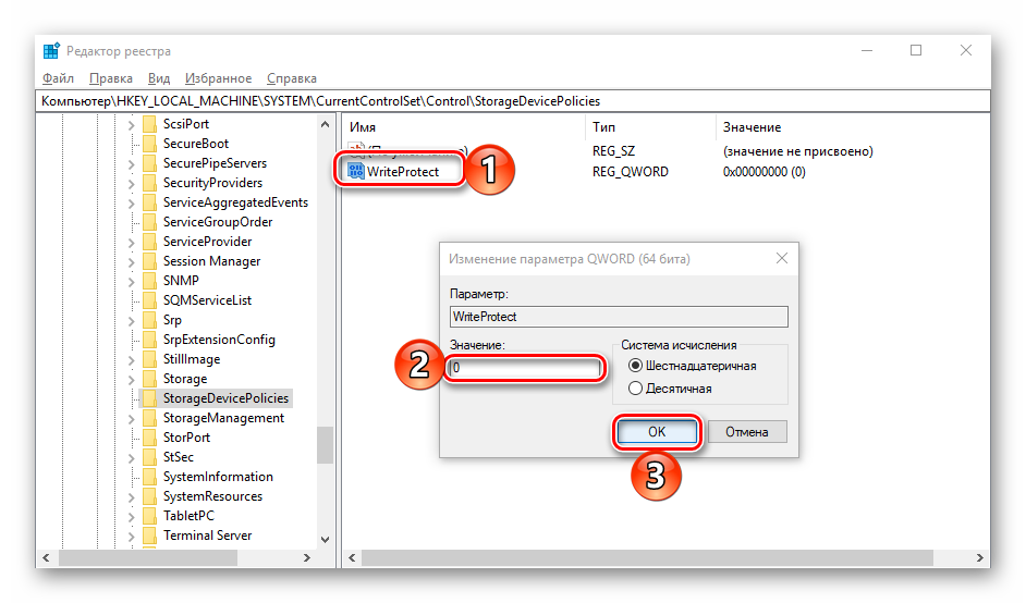 - Слева необходимо пройти по пути: «HKEY_LOCAL_MACHINE \ SYSTEM \ CurrentControlSet \ Control \ StorageDevicePolicies». В правой части должен появиться параметр под именем WriteProtect, который имеет значение «1». Его необходимо заменить на стандартный «0», для чего нужно дважды нажать на значение и ввести цифру.