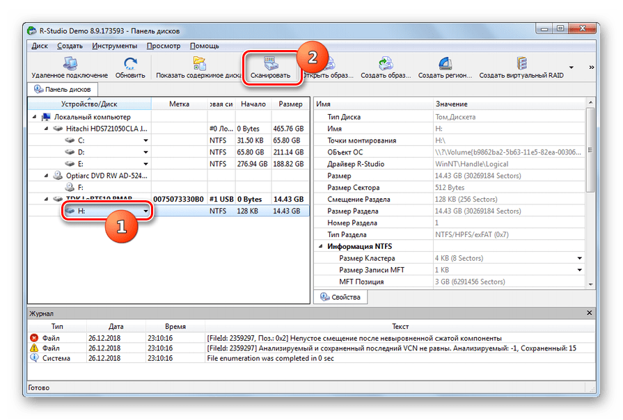 - Подключите флешку к компьютеру и запустите R-studio. Во вкладке «Панель дисков» отыщите и выделите букву раздела, которая соответствует проблемной флешке, а затем щелкните по элементу «Сканировать».