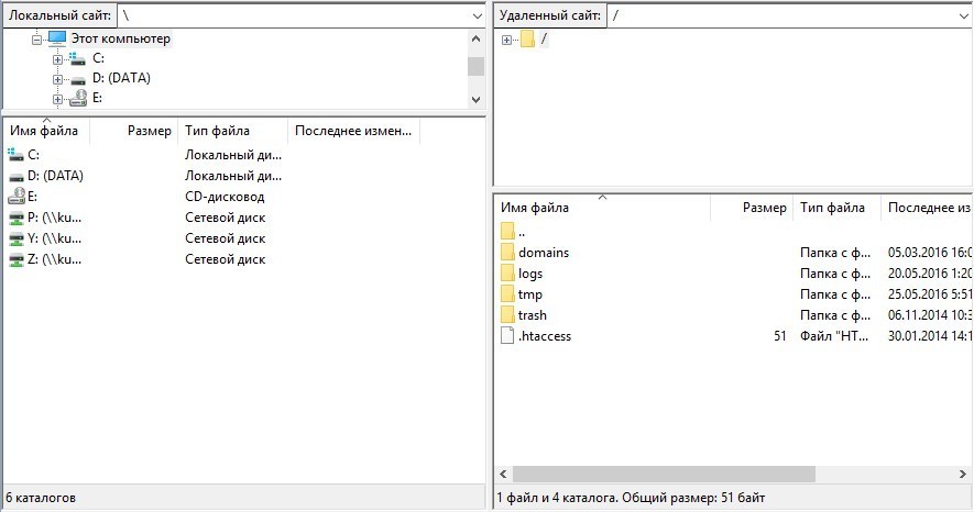Здесь обычно проблем и вопросов не возникает, так как пользоваться FileZilla очень просто, и всё интуитивно понятно. Работа происходит, как в любом файловом менеджере – с одной стороны показаны файлы и папки на компьютере, а с другой – на сервере.