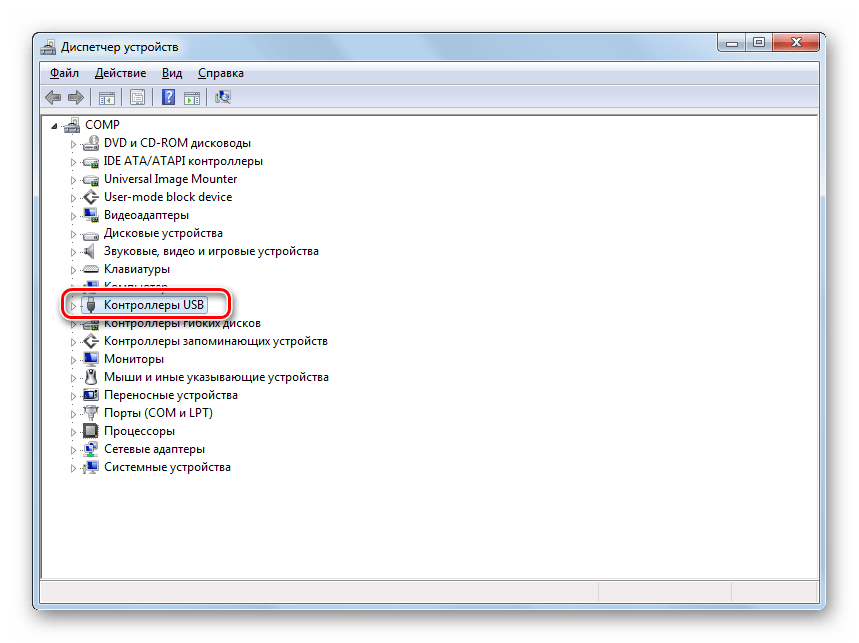 - Запустите «Диспетчер устройств» и откройте в нем блок «Контроллеры USB».