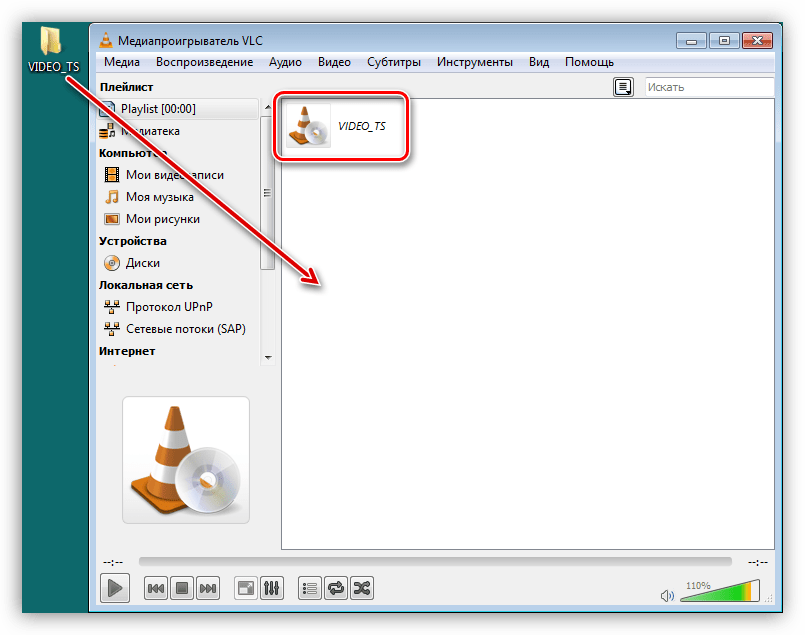 Эту папку можно скопировать в любое удобное место, а для воспроизведения нужно целиком перетянуть ее в окно плеера. Для этих целей отлично подойдет VLC Media Player, как наиболее всеядный в плане форматов файлов.