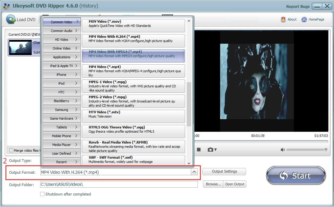 Чтобы преобразовать DVD в формат MP4, нажмите «Формат вывода» внизу, а затем вы увидите всплывающий список. Выберите формат MP4 из общего списка видео в качестве формата вывода, вы также можете использовать этот DVD Ripper для преобразования DVD-фильмов в H.264 MP4 и H.265 MP4.
