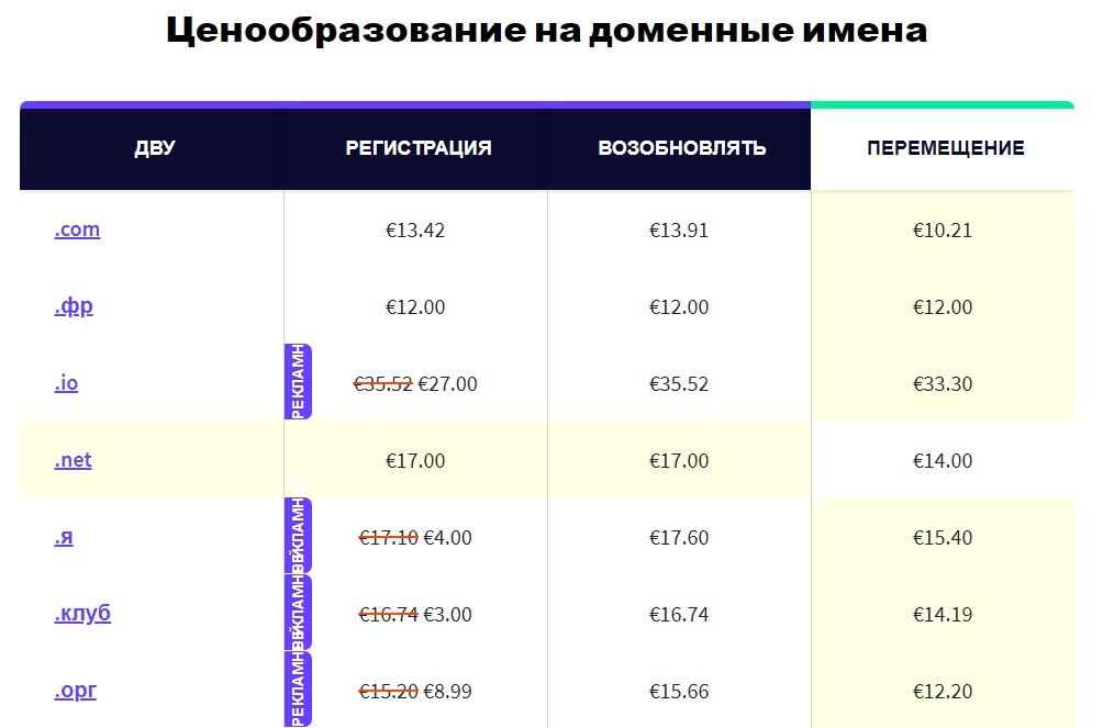 Обратите внимание, что для разных типов доменных имен назначены свои сроки аренды и периоды повторной регистрации