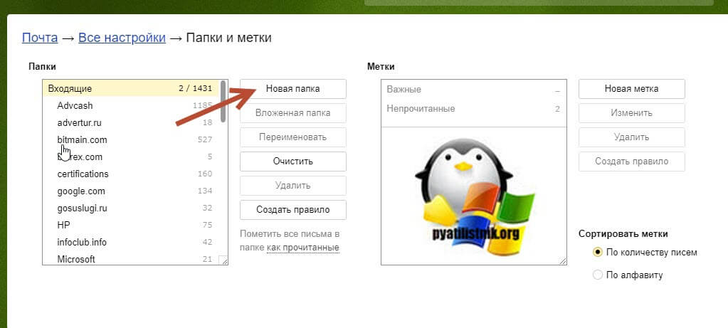 У вас откроются все настройки почтового ящика. Первым делом я вам советую создать отдельную папку под нужный домен или почту по критериям, у меня это будет сервис reddit. Создаю в папке «Входящие» новую папку, для этого нажимаем соответствующую кнопку.