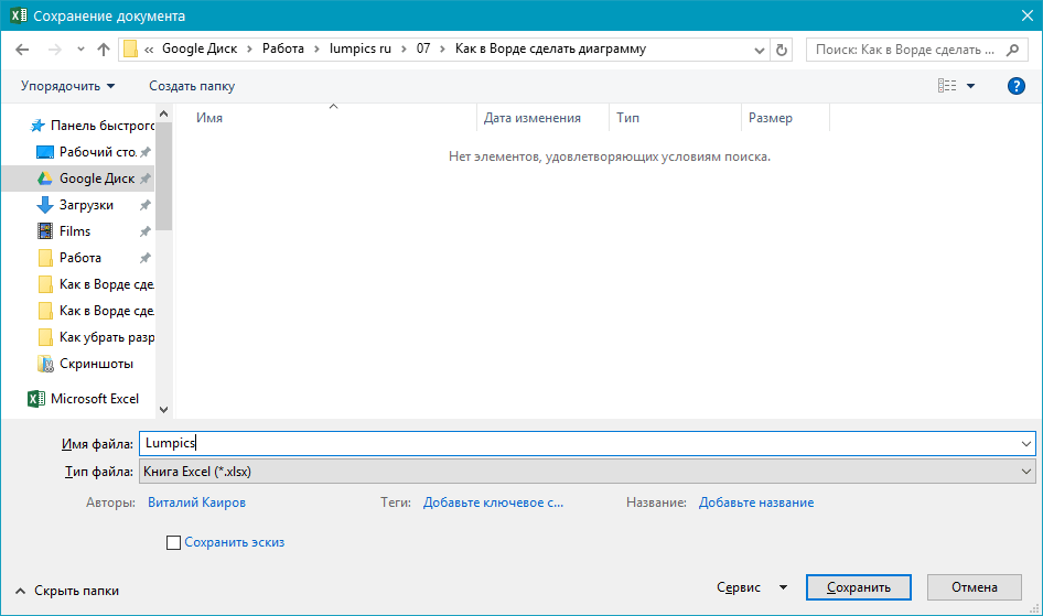 Выберите место для сохранения документа и введите желаемое имя. Нажмите по кнопке «Сохранить», после чего документ можно закрыть.