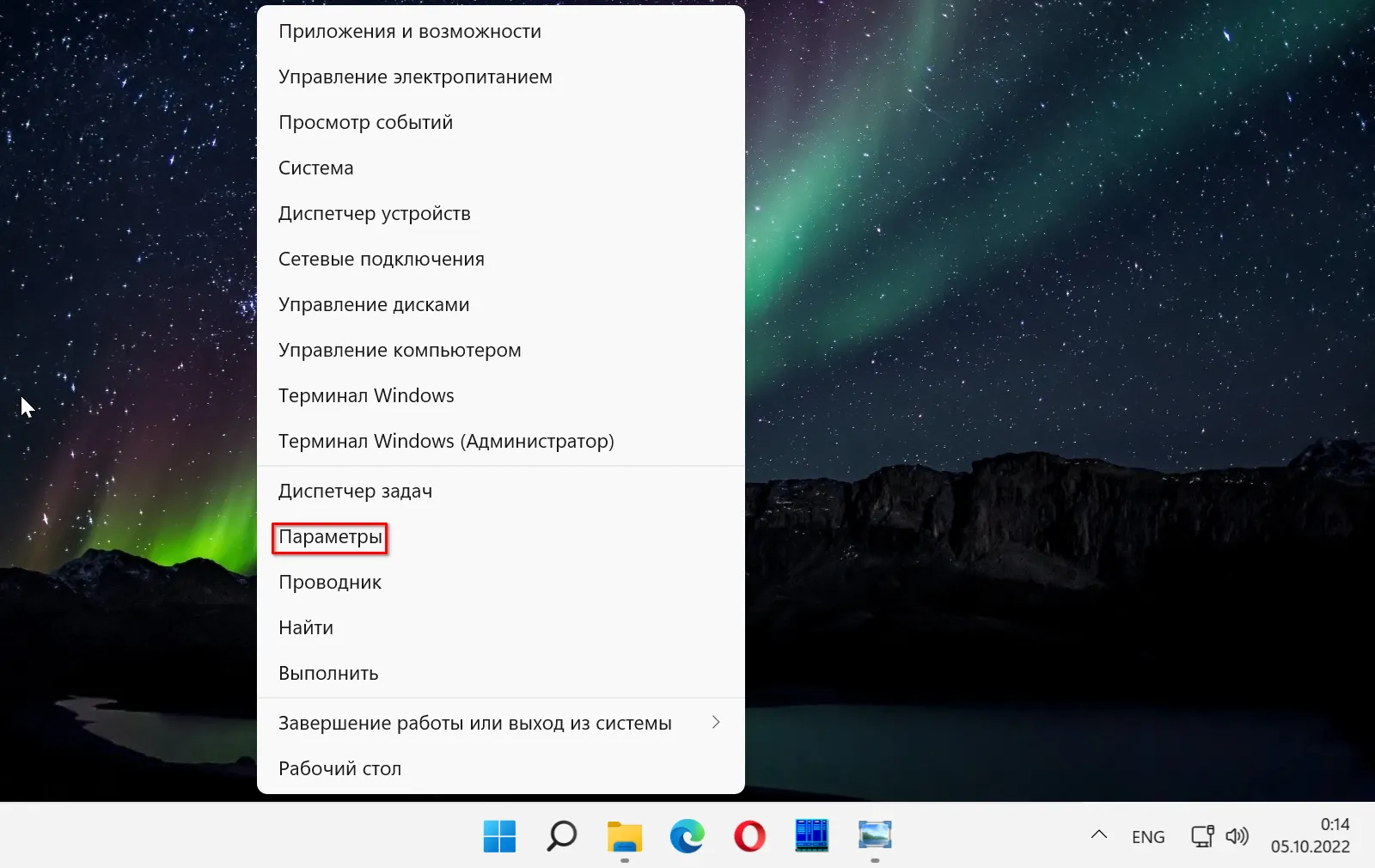 Кликните по «Пуску» правой кнопкой мыши. Откройте «Параметры».