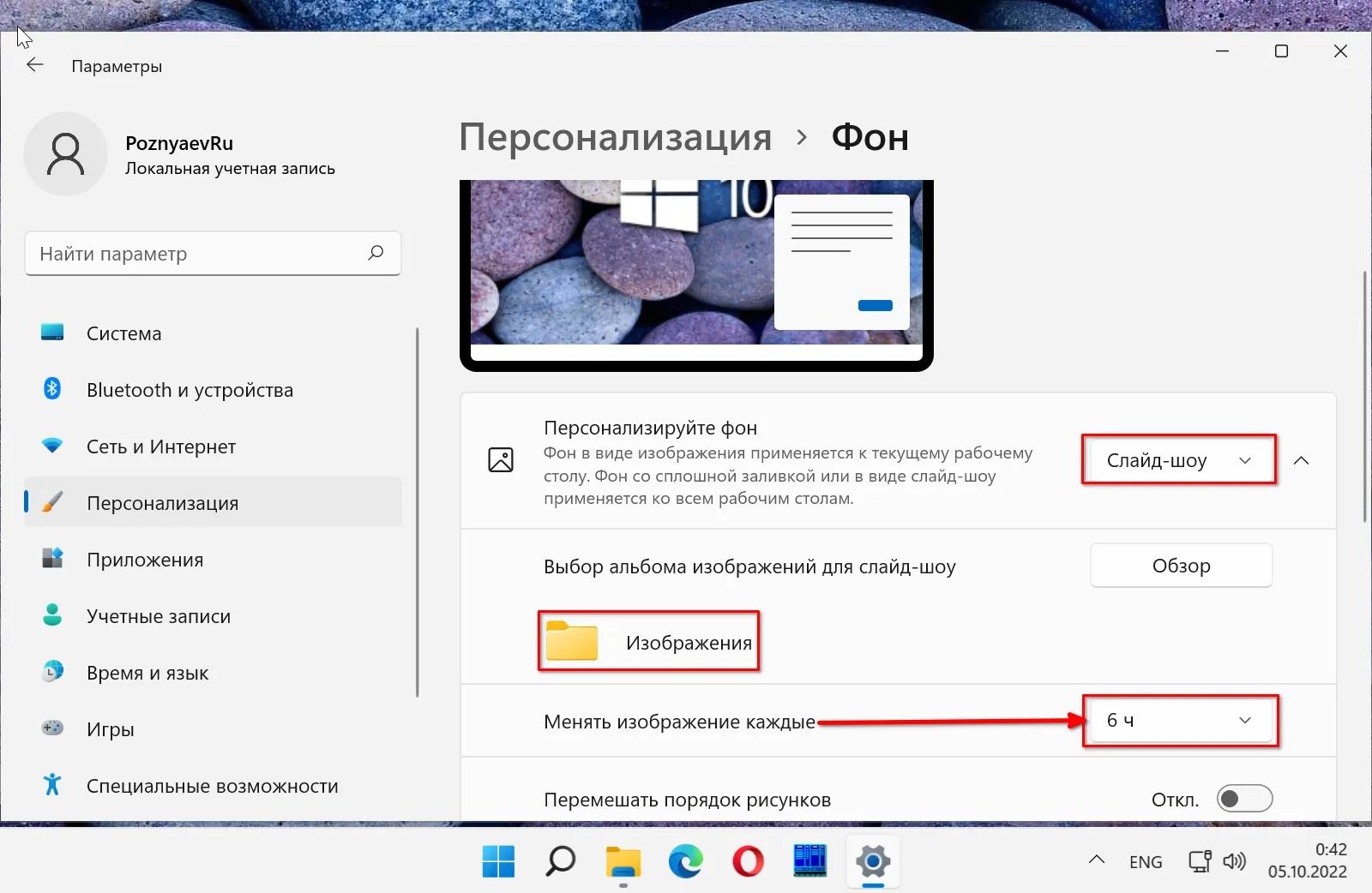 В текущем варианте настроек картинки из папки «Изображения» будут сменять друг друга на рабочем столе каждые шесть часов.
