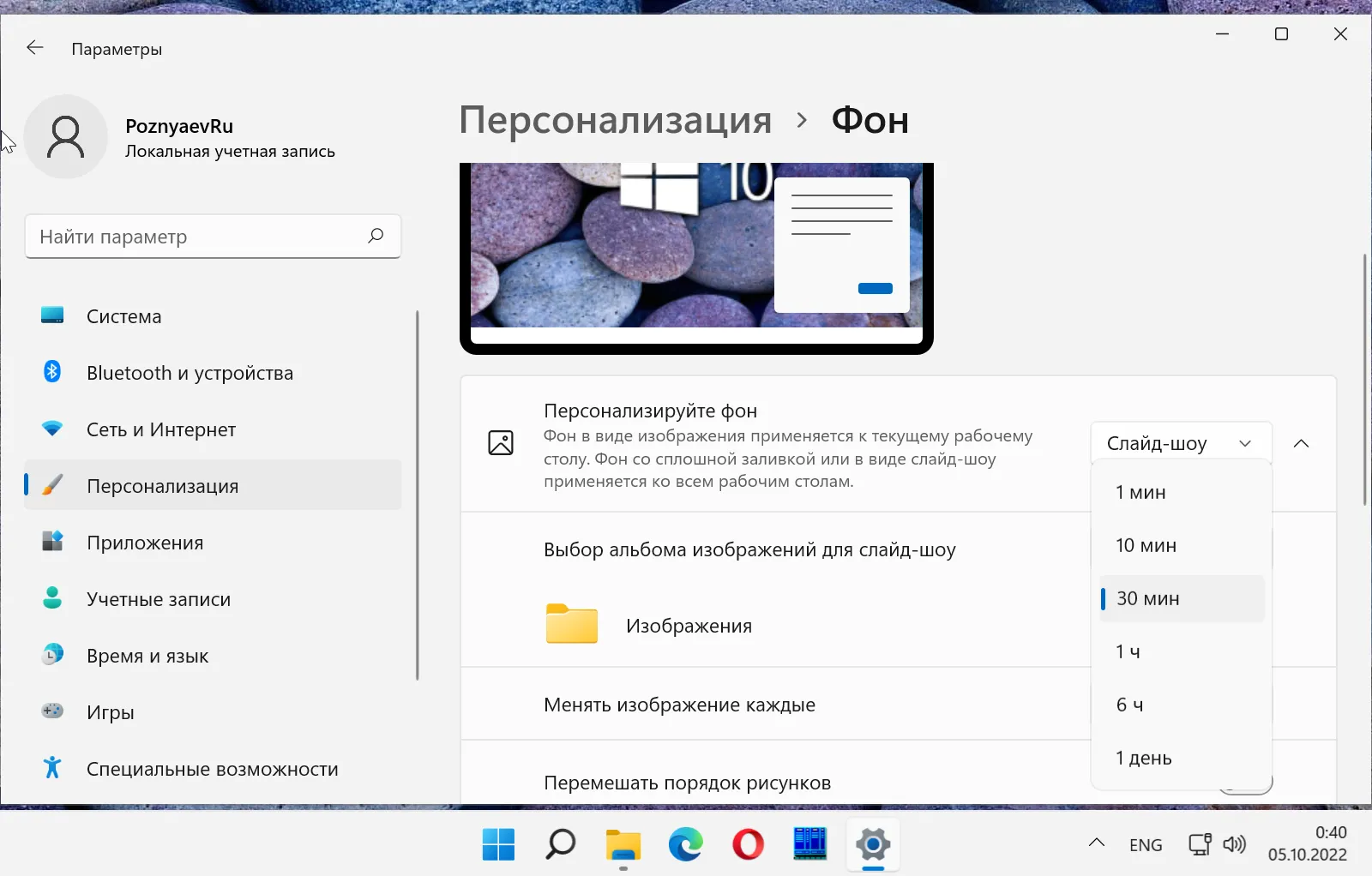 Справа от надписи «Менять изображения каждые» находится список. Выберите оттуда время, через которое фоновый рисунок рабочего стола будет меняться. Доступные варианты: 1, 10 минут, полчаса, 1 или 6 часов, 1 день.