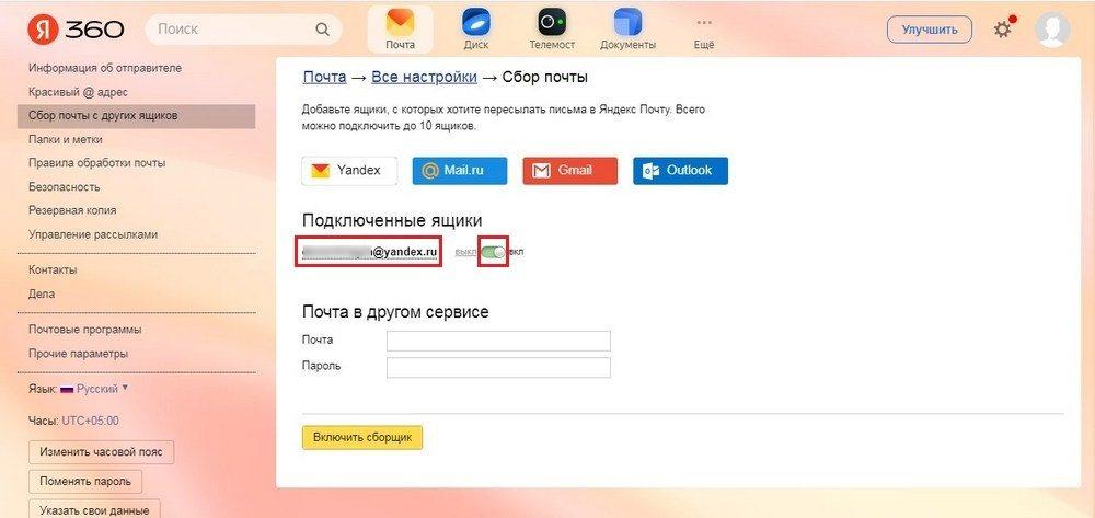 - Далее в открывшемся окне слева выбираем вкладку «Сбор почты с других ящиков».