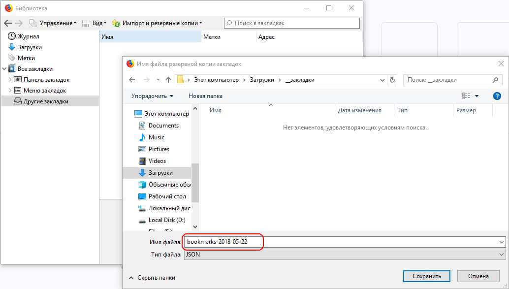 - Укажите имя файла. По умолчанию оно создается как «bookmarks», предлагаю добавить к имени дату, так легче ориентироваться впоследствии.