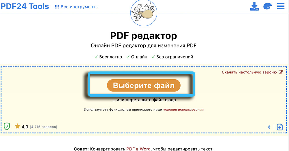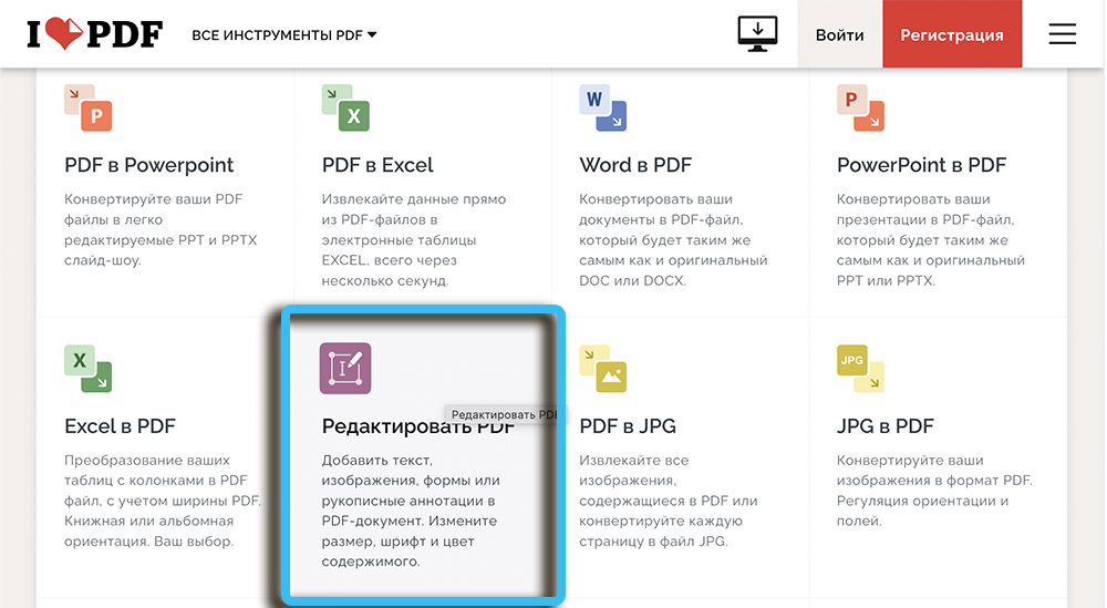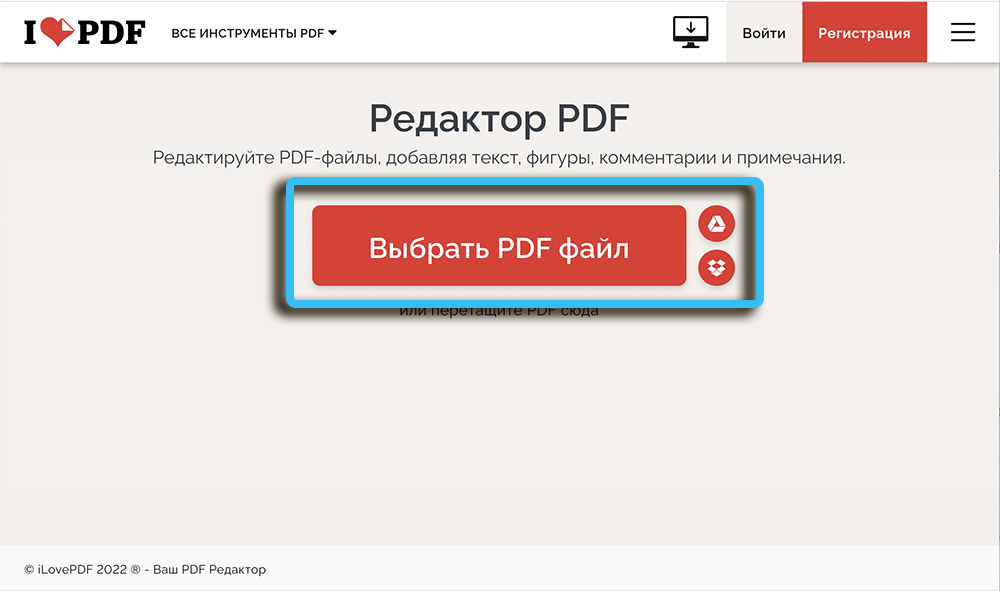 Чтобы начать работу, достаточно просто открыть этот сайт и в меню выбрать функцию «Редактировать». Файлы для изменения могут загружаться напрямую с компьютера или из облачных хранилищ по типу Dropbox или Google Drive.