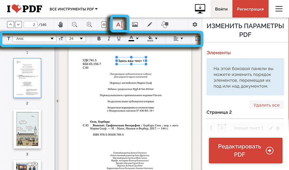 Не менее удобный ресурс для бесплатного редактирования PDF-документов в режиме онлайн без необходимости устанавливать на компьютер какой-либо софт. Пользователям доступны инструменты для вставки нового текста, встраивания штампов, добавления изображений, снятия защиты на редактирование, а также создания полностью пустых страниц.