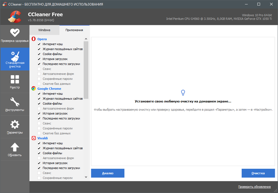 - А также можно поставить галочки на очистку нужных нам компонентов.