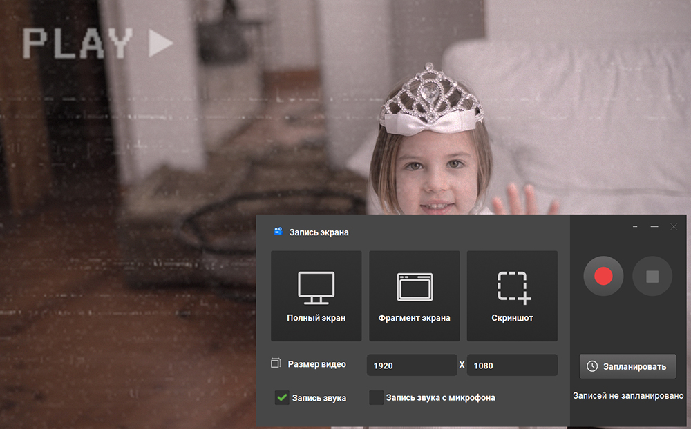 2. Настройте параметры съемки. Запустите рекордер и нажмите на «Запись экрана». Выберите «Полный экран» и поставьте галочку рядом с «Запись звука». Захват аудио с микрофона необходимо отключить.