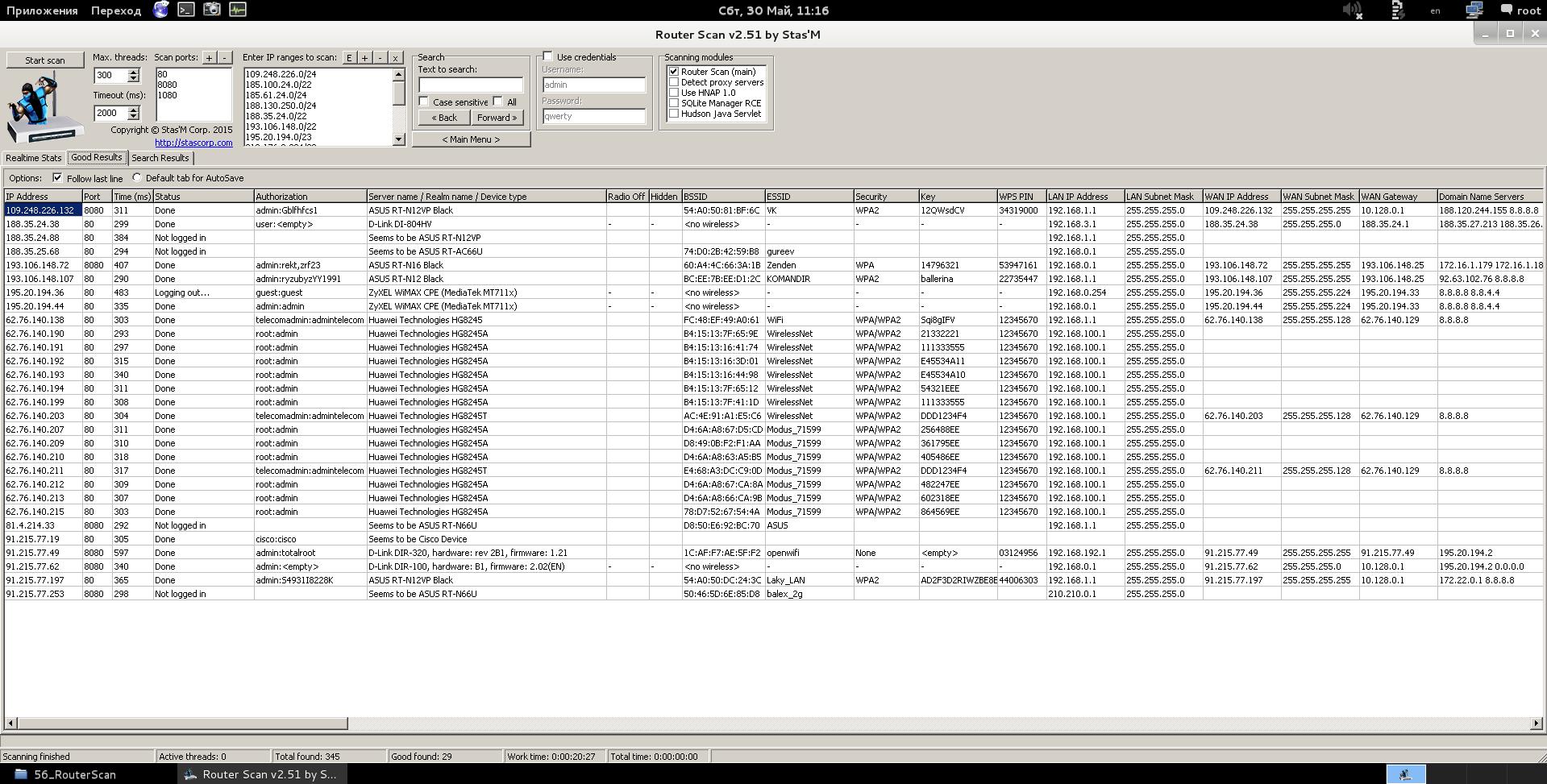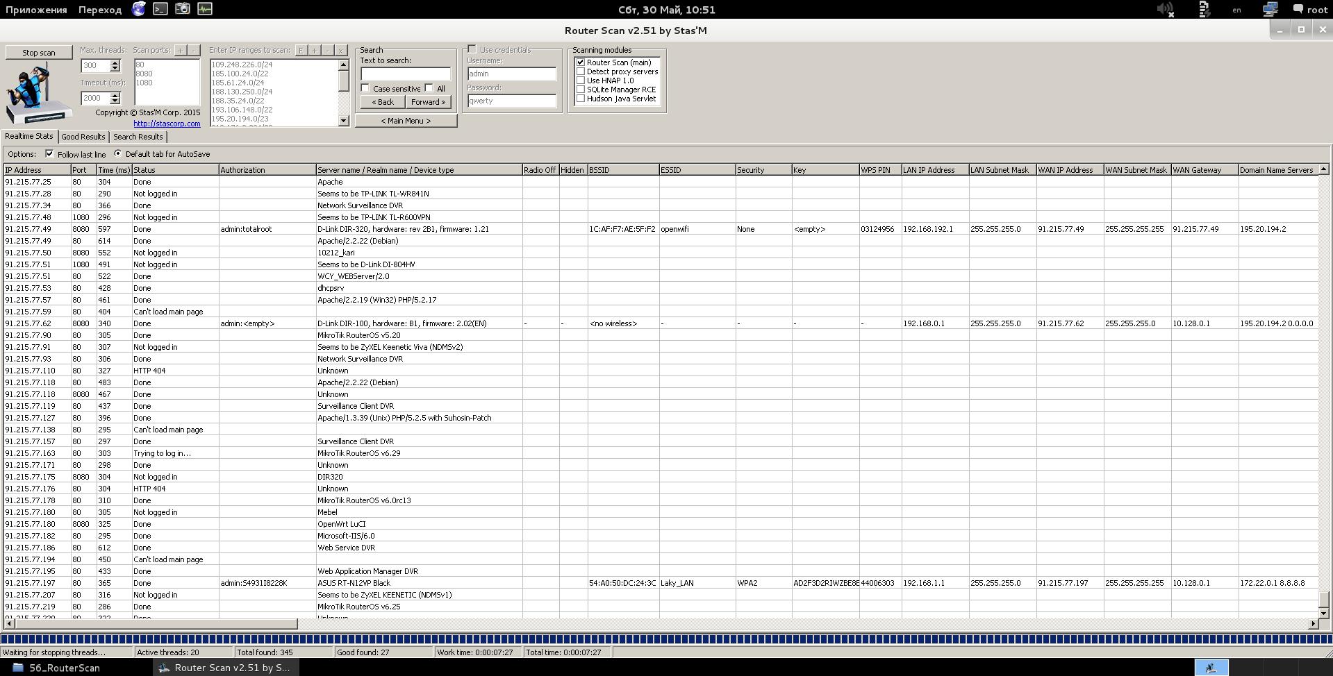 Вот пример работы Router Scan от Stas’M в Linux (сканирую диапазоны адресов моего родного города Муром):