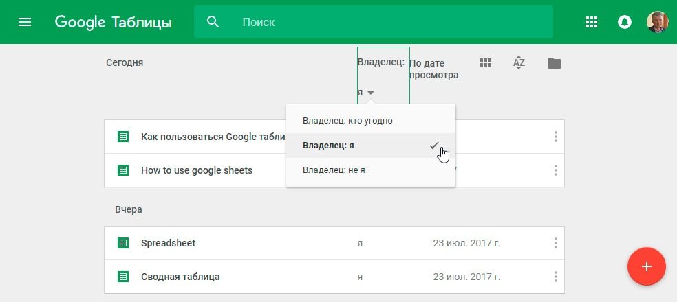 Обратите внимание, что на главной странице Google Sheets есть возможность установить фильтр в зависимости от того, кто является владельцем файла