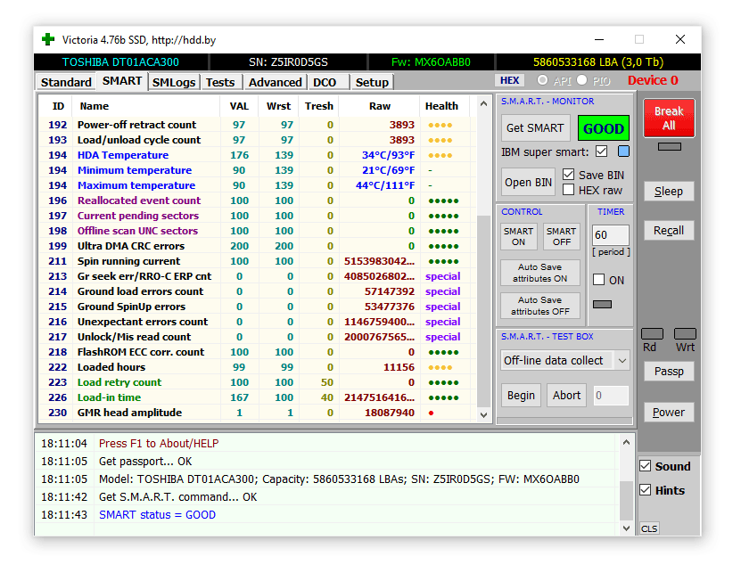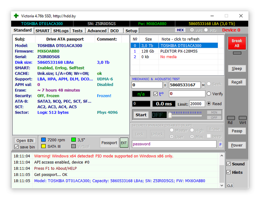 - Полноценная поддержка USB-SATA накопителей — на ноутбуке и ПК. Можно проверить работоспособность, используя SMART-тесты, управлять кэшем и уровнем шума. Также Victoria очень подробно отображает паспорт HDD-накопителя.