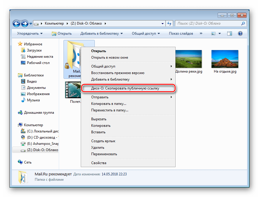Быстро делиться файлами и папками на диске можно путем получения ссылки. Для этого нажмите правой кнопкой мыши на файл и из контекстного меню выберите пункт «Диск-О: Скопировать публичную ссылку».