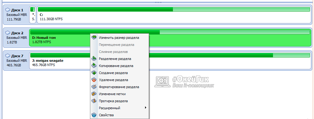 – удалить раздел. Не нажимайте на пункт без основательного обдумывания последствий. Если удалите раздел, то информацию на нем будет возможно спасти только с помощью специальных программ, да и то не всегда. -