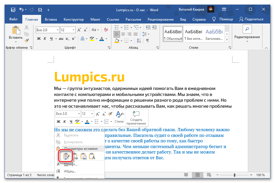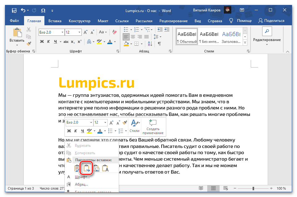Другим возможным методом вставки скопированного текста является обращение к контекстному меню, вызываемому нажатием правой кнопки мышки (ПКМ) в нужном месте документа. В отличие от рассмотренного выше решения, такой подход предоставляет до четырех различных вариантов, определяющих конечный вид исходной записи. Рассмотрим каждый из них.