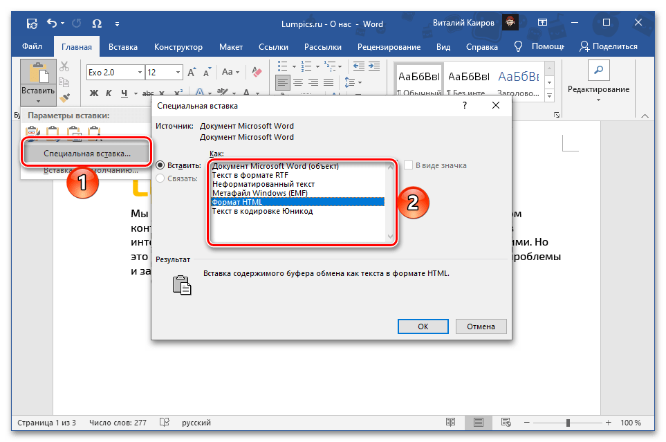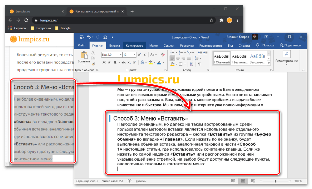Содержимое буфера обмена будет вставлено в документ Ворд в том же виде, в котором оно было изначально, за исключением разве что неподдерживаемых программой объектов и стилей. Если такой вариант вас не устраивает, ознакомьтесь со следующими способами.