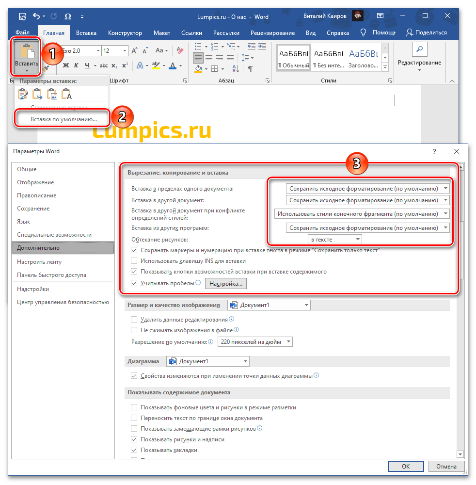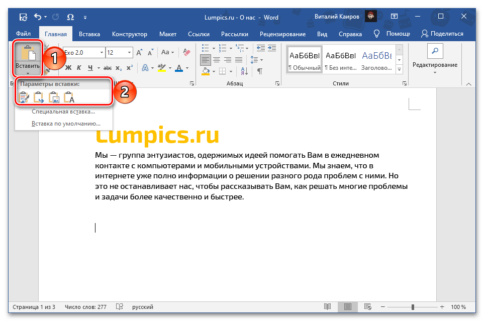Наиболее очевидным, но далеко не таким востребованным среди пользователей методом вставки является использование отдельного инструмента текстового редактора – кнопки «Вставить» из группы «Буфер обмена» во вкладке «Главная». Если нажать по ее значку, будет выполнена обычная вставка, аналогичная таковой в части «Способ 1» настоящей статьи, где использовалось сочетание клавиш. Если же нажать по самой надписи «Вставить» или расположенной под ней указывающей вниз стрелкой, на выбор будут доступны следующие пункты, аналогичные таковым в контекстном меню: