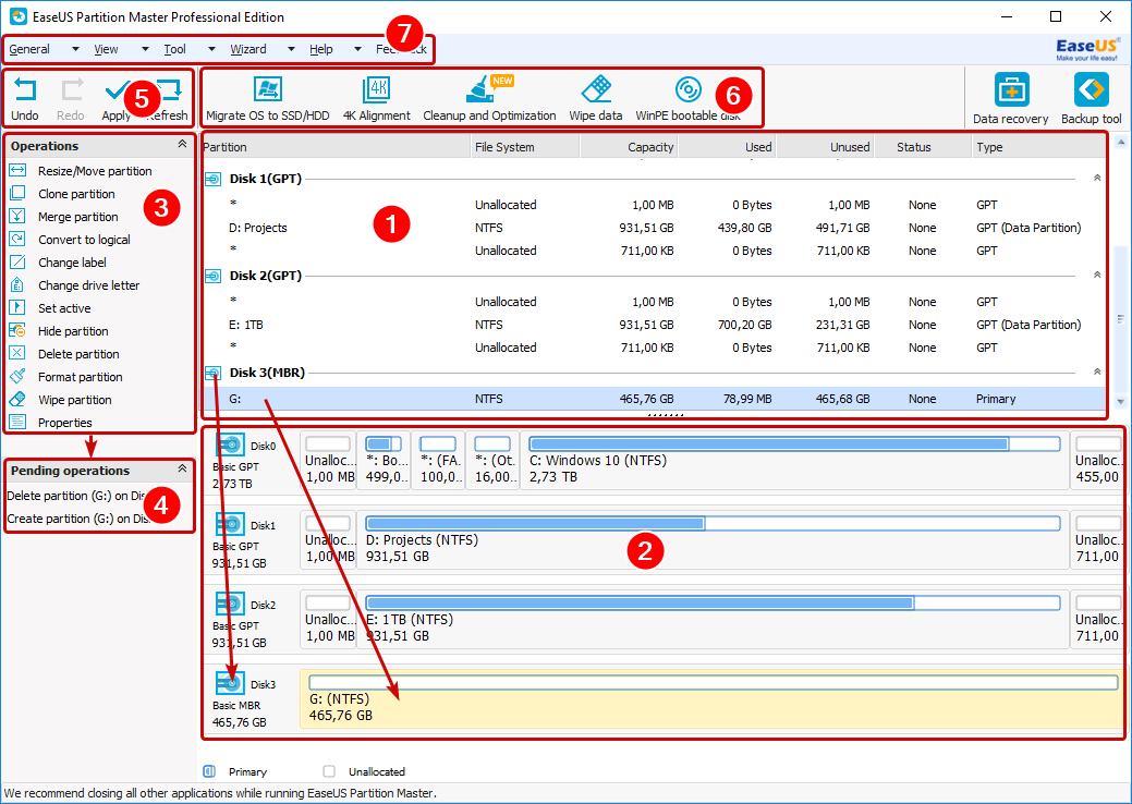 Операции, затрагивающие изменение разделов, применяются не сразу. Они появляются в списке отложенных действий (4). Нужно нажать кнопку «Apply» (5), чтобы начать процесс изменений разделов.