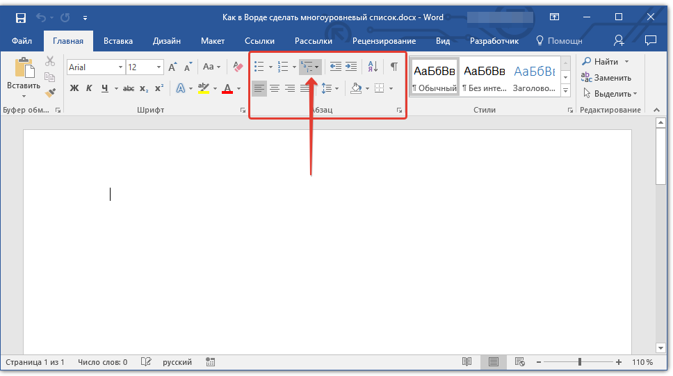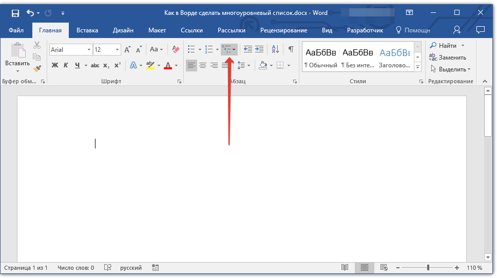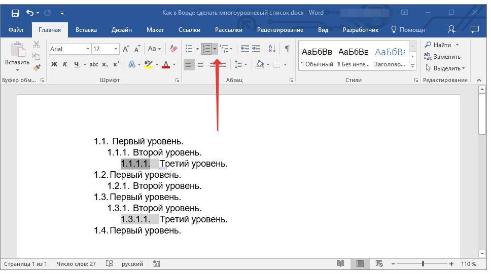 - Щелкните по стрелке возле кнопки «Многоуровневый список».