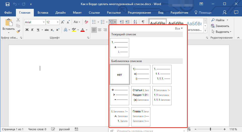 Чтобы начать работу над многоуровневым перечислением, достаточно нажать стрелку справа от кнопки «Многоуровневый список» и выбрать нужный стиль маркеров или нумерации.