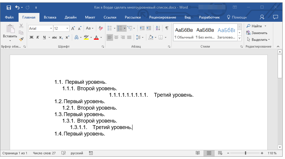 Нумерованный список — это список, который содержит элементы с отступами на разных уровнях. Microsoft Word имеет встроенную коллекцию списков, из которых пользователь может выбрать подходящий стиль. Также в Word вы можете сами создавать новые стили многоуровневых списков.