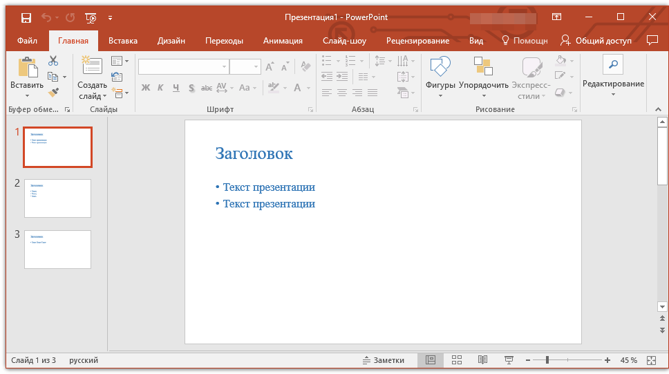 После того как доклад создан, его необходимо оформить. Как правило, на всех страницах должен быть текст – короткие фразы или целые предложения. Вставлять текст можно напрямую из других документов или же добавлять самостоятельно, к примеру: