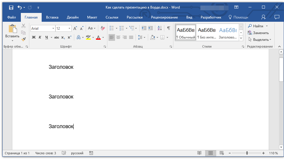 1. Определитесь с тем, сколько у вас будет слайдов в презентации и отдельной строкой пропишите в документе Word заголовок для каждого из них.