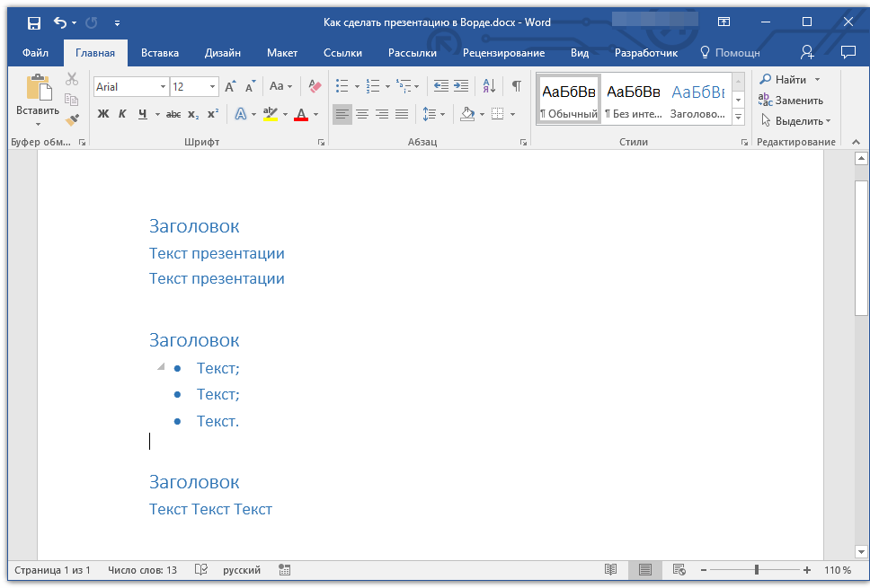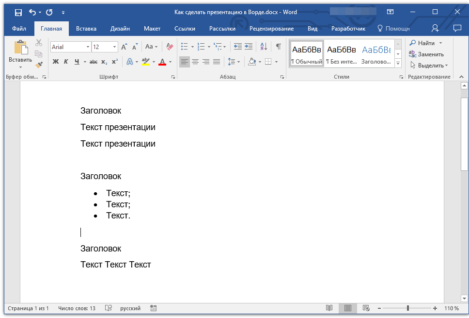 Примечание: В Ворде можно создать заголовки и текст для слайдов презентации, изображение же лучше вставлять уже в PowerPoint. В противном случае графические файлы будут отображаться некорректно, а то и вовсе будут недоступны.